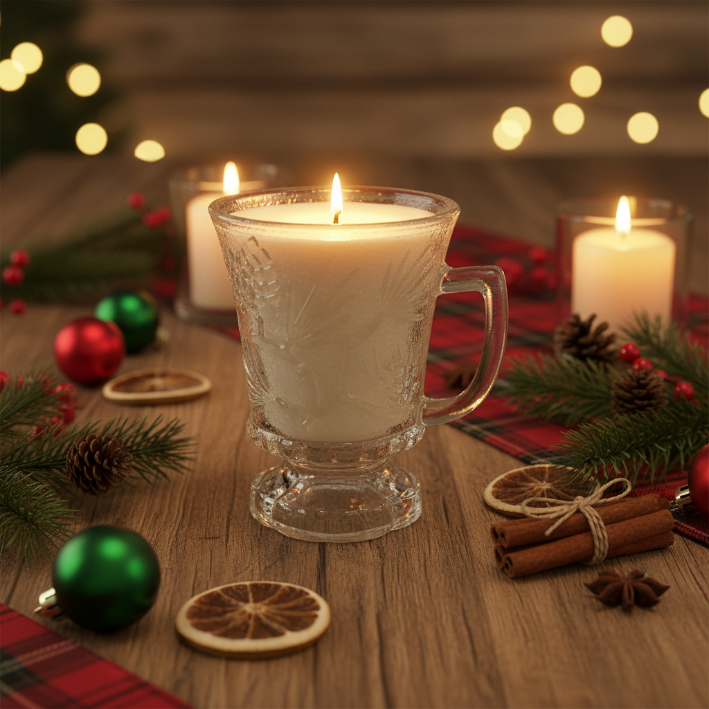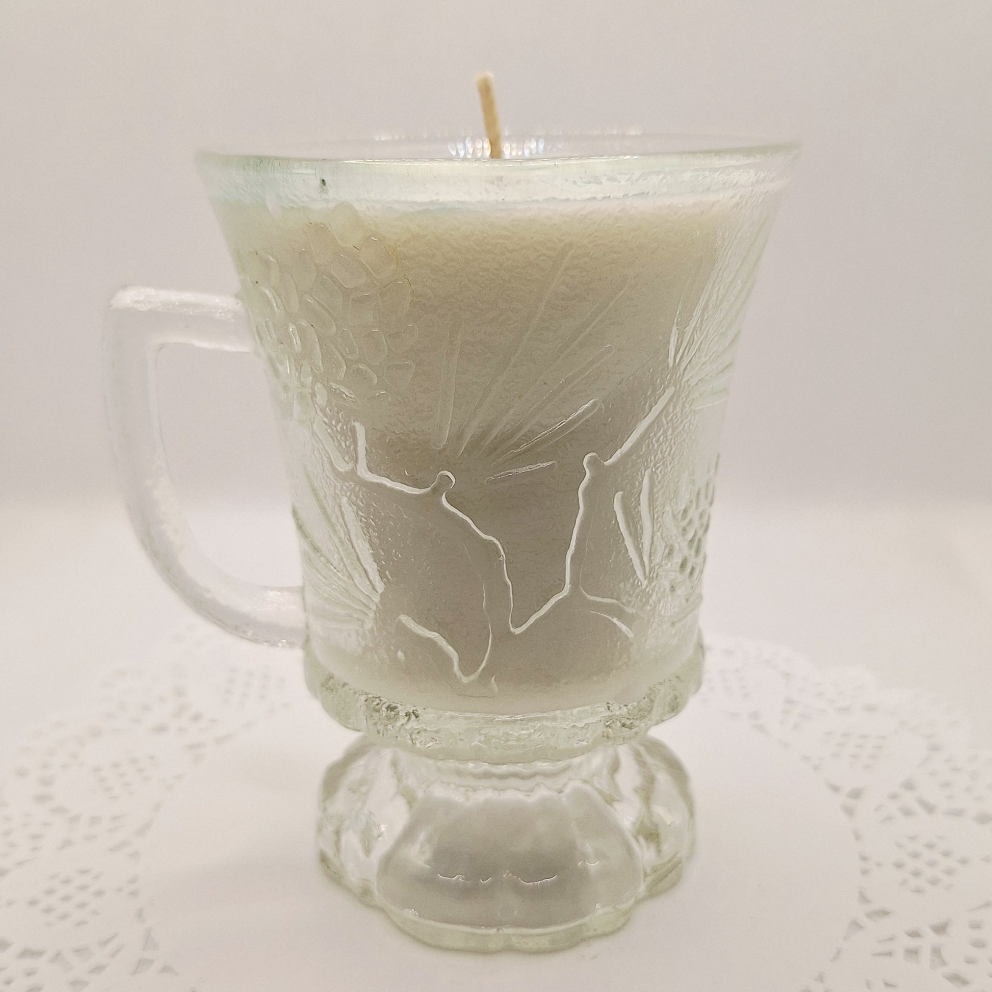 Experience the enchanting glow of our Vintage Tiara Ponderosa Mug Soy Wax Candle. This 7 oz candle is handmade from a vintage Tiara glass mug in the Ponderosa pattern, giving it a unique and charming touch. The woodsy fragrance of woodland elves will transport you to a magical pine forest.