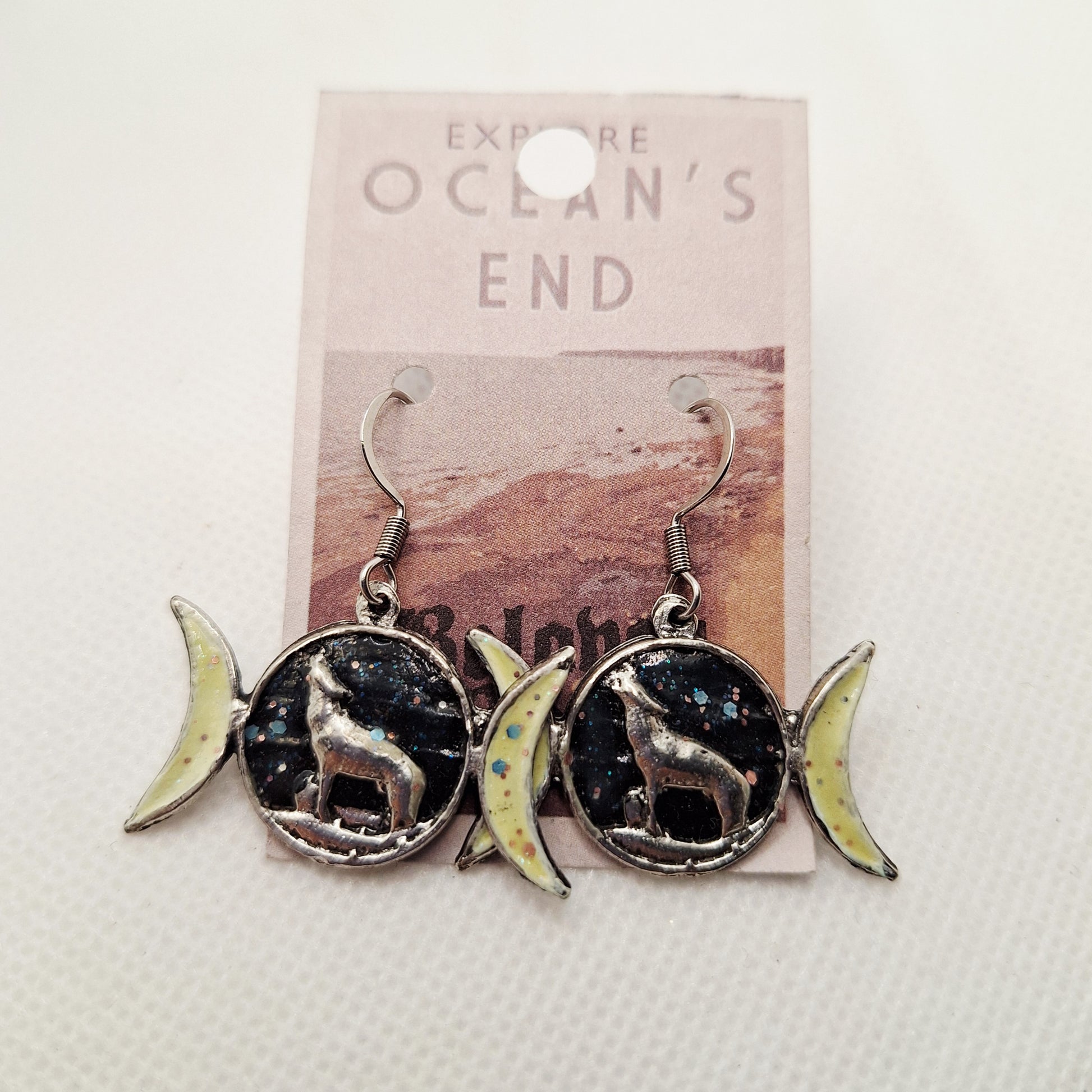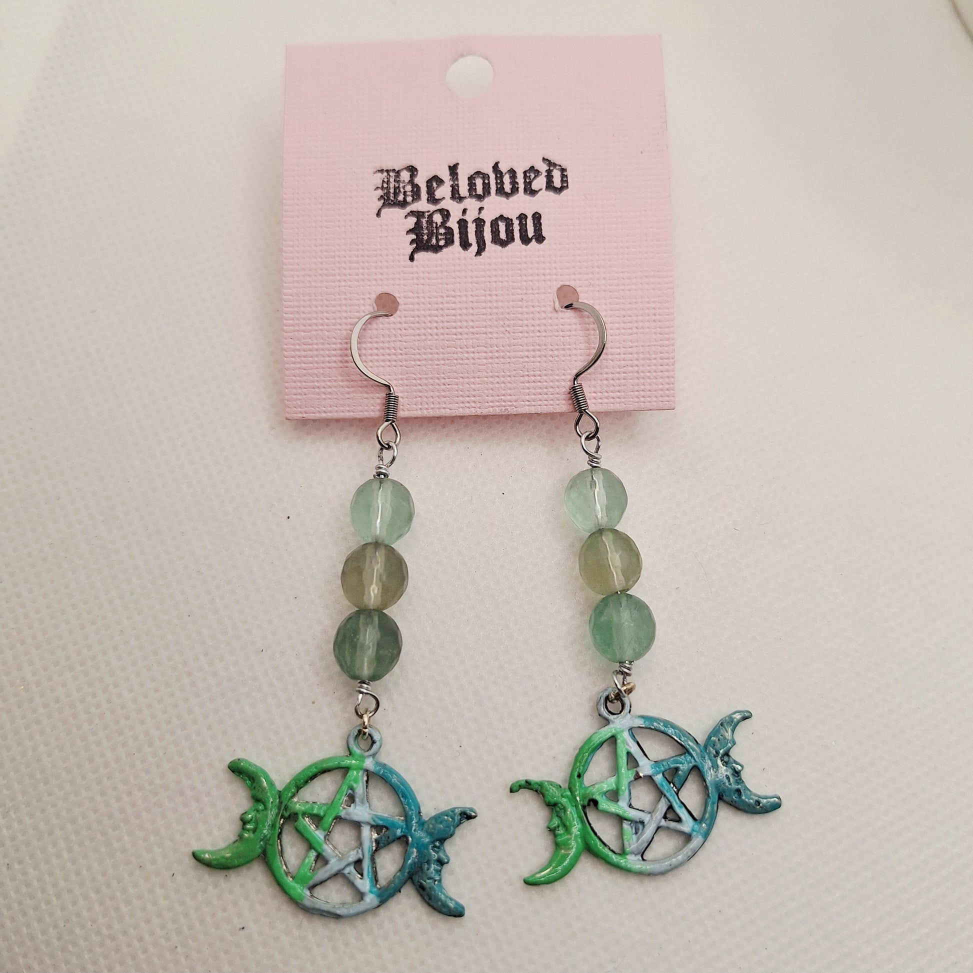 Let your inner goddess shine with these handpainted Tibetan silver earrings featuring the triple moon and pentacle symbols. Channel your celestial energy and make a statement with these unique, limited edition accessories.
