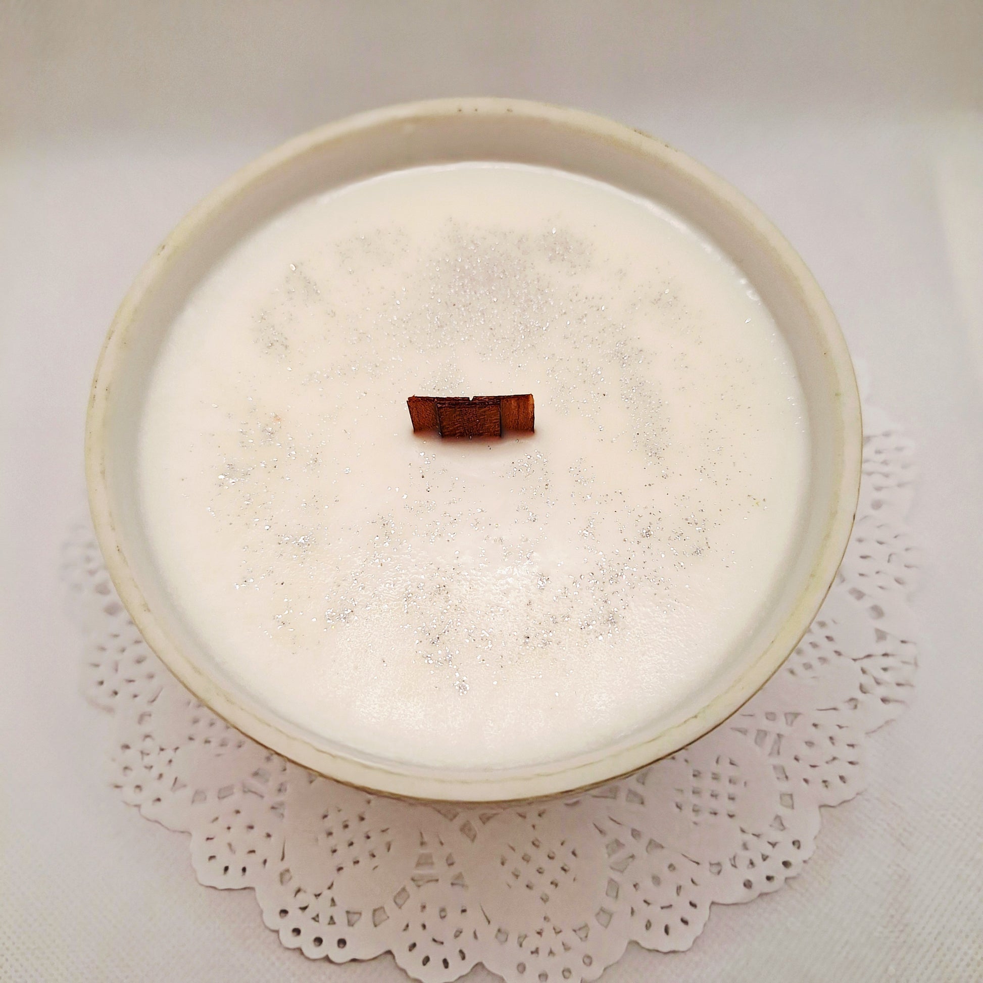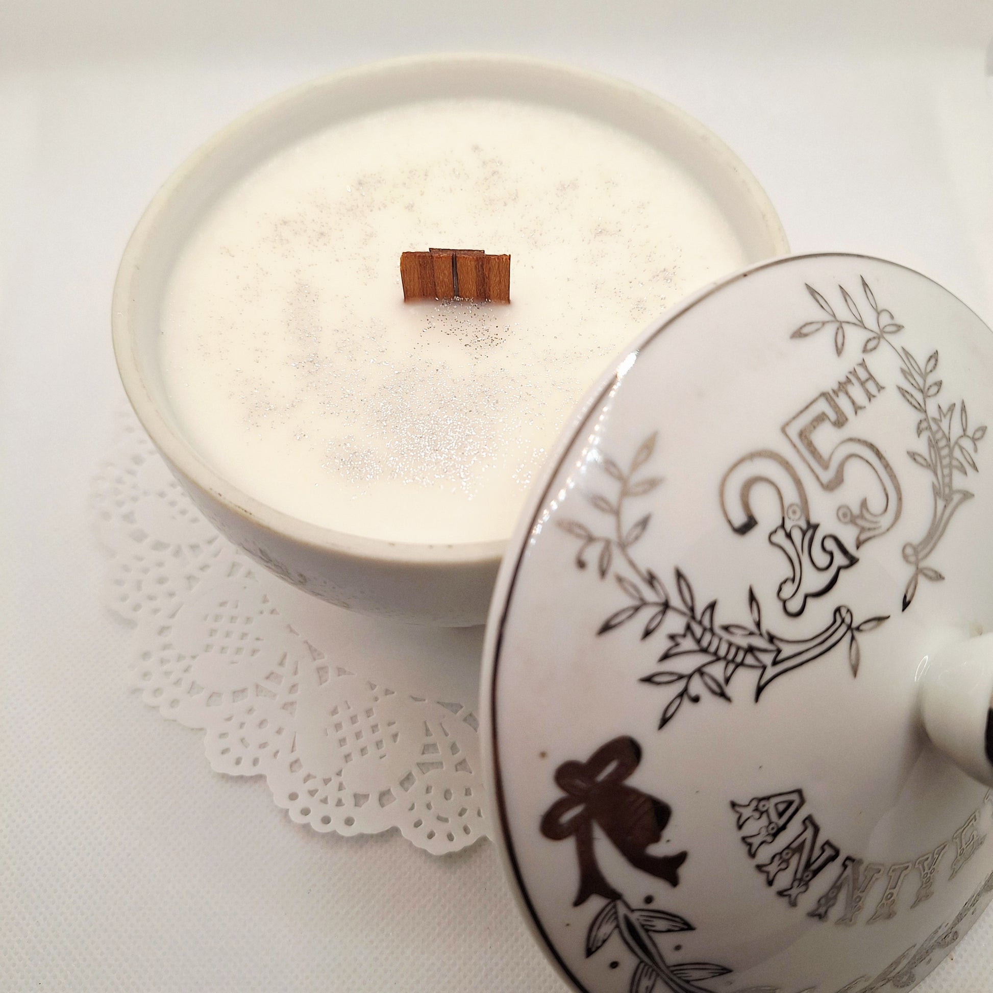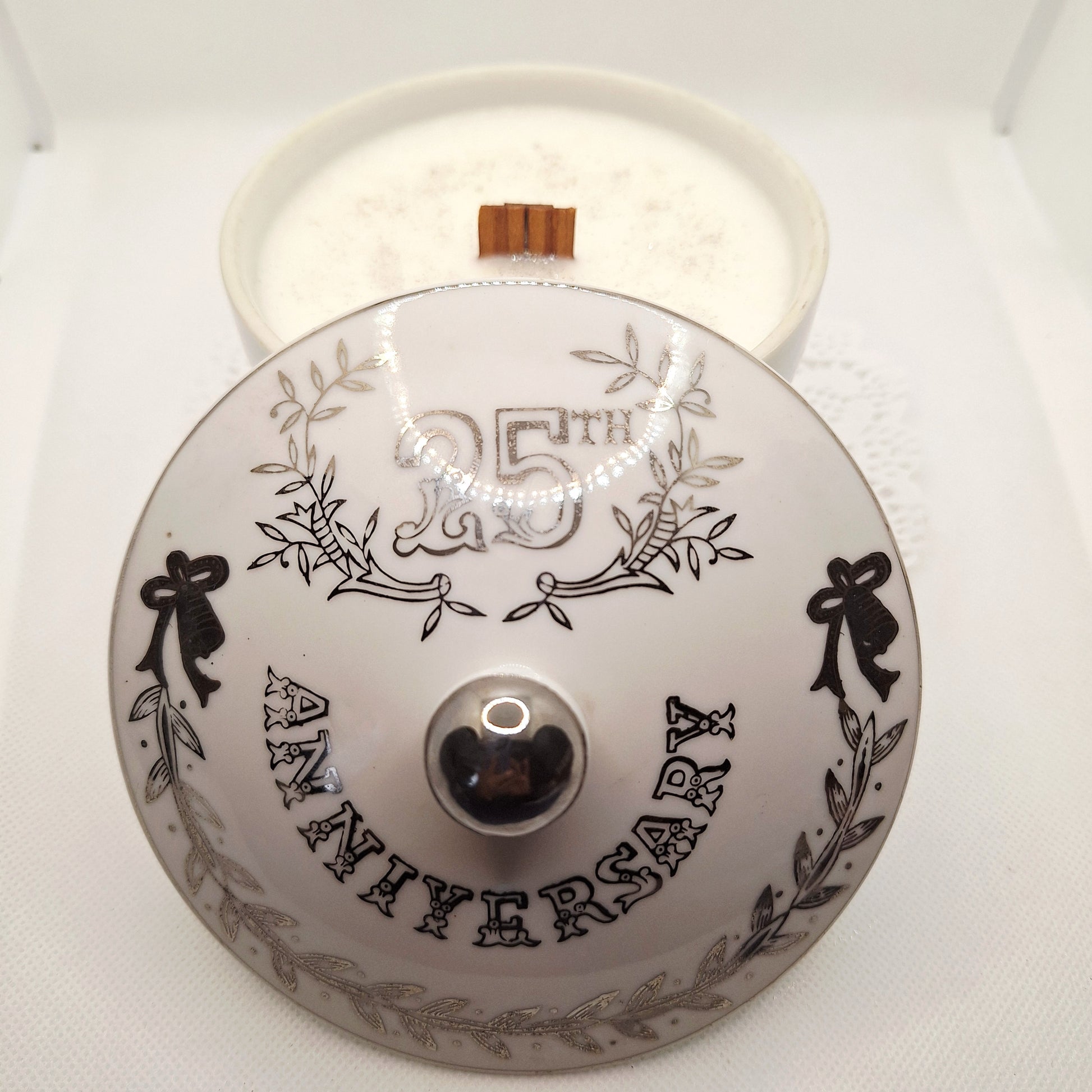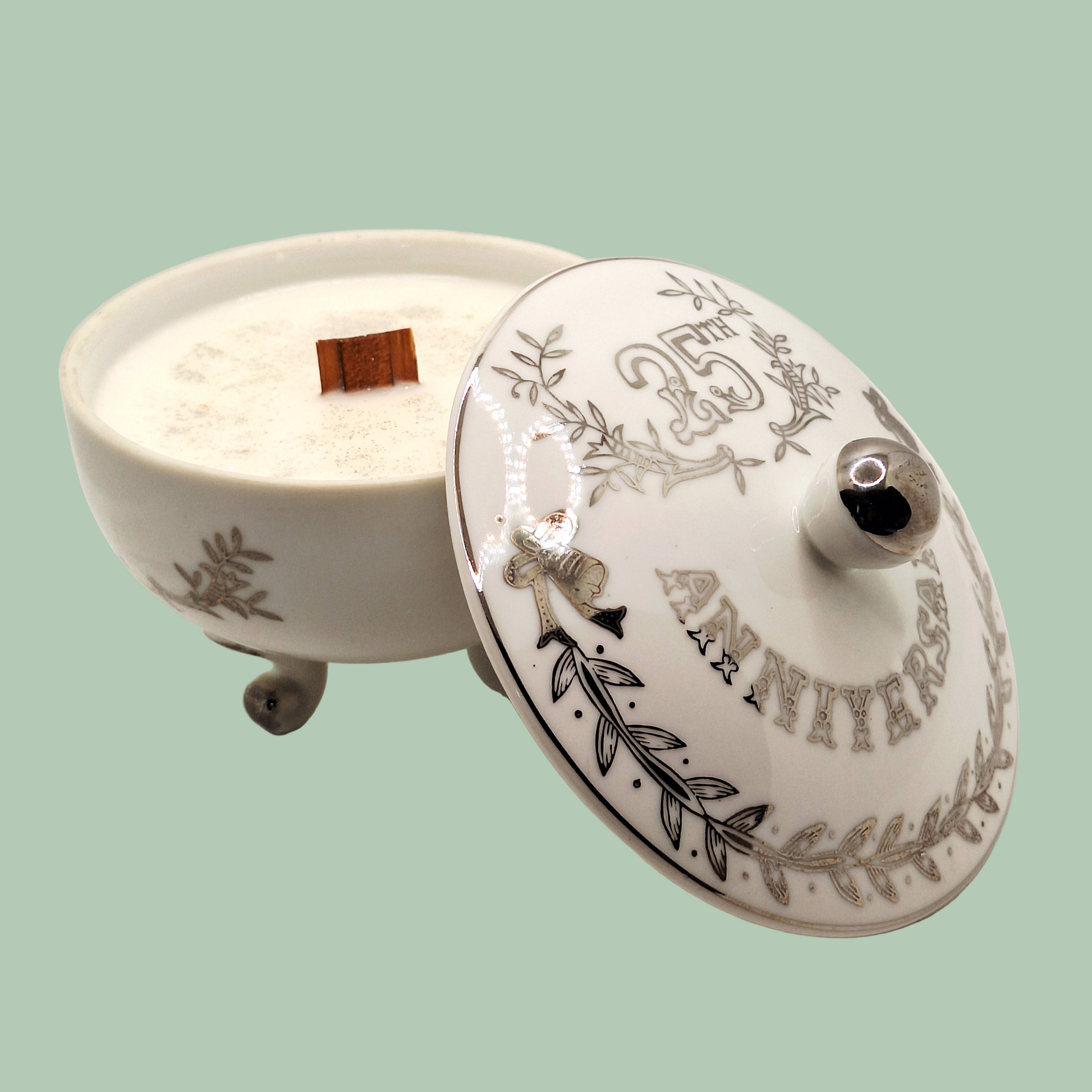 Lefton 25th Anniversary 8 oz Footed Dish Wood Wick Candle